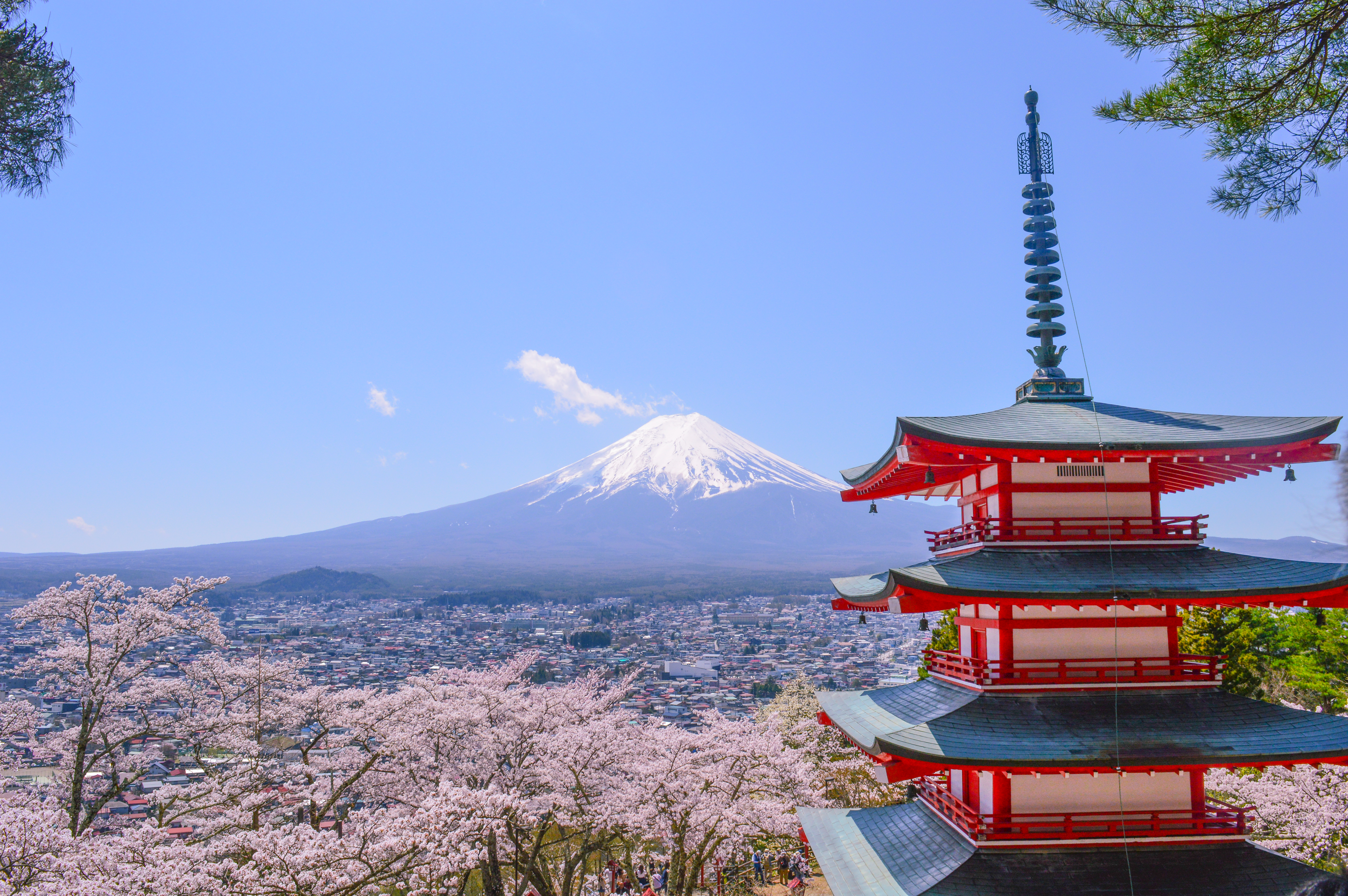 This image is probably one of the most famous and well known images of Japan, sakura flowers, Mount Fuji and a vermillion structure all in one place!