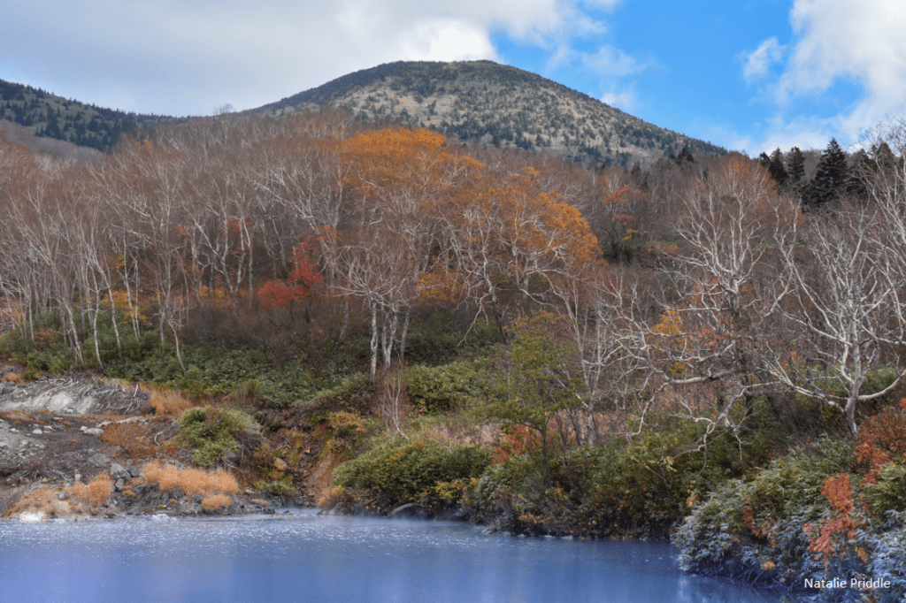 It was pretty much a straight shot back to Aomori city, on beautiful mountain roads lined with orange and red leaves. Japan has great provisions for tourist spots along the road, as a rule if you see a random lay-by there is probably something to see. We pulled into one of these random lay-bys and found ourselves in hell… or at least that is what the sign said. We were at Jigokunuma, a sulphur pond with a mist of fumes coming out of it! The water was a peculiar light blue and at the shallow edges of the pool you can see the yellow sulphur deposits. Also it stank!