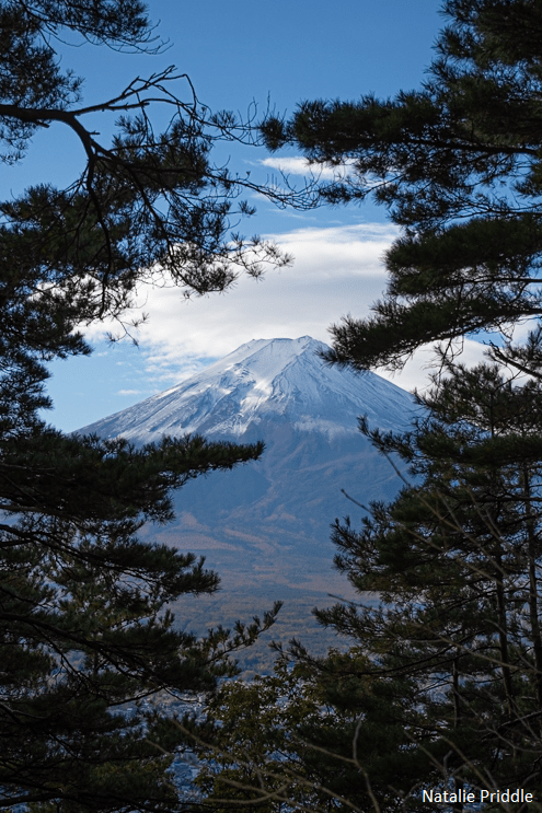 They, of course, encouraged me to also pop my head into the hole so that I could hear Mount Fuji breathing. It was sort of like the sound of a seashell held against your ear, but saying it is Mount Fuji is more exciting! The small rope around the rock denotes that it is sacred, so best to bow on your way past. Opposite from the stone, pointing back down Mount Arakurayama, was a small break in the trees with a sneaky view of Fuji. To get it you had to scramble down the steep side a little, they said it was safe!