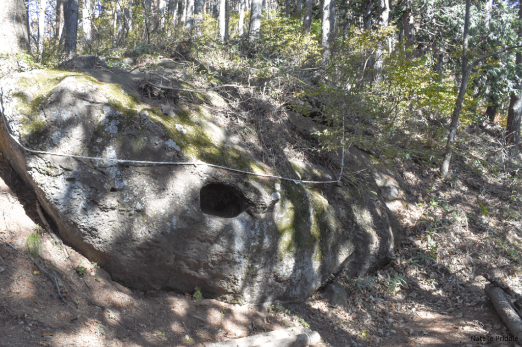 This region has a number of places to explore and good views, other than from behind the pagoda. To the left of where the photo is taken are terraces covered in sakura trees, and above that a rest house where you can sit for a time. From our previous visits we knew that if you climbed for around 10 minutes you would get to a secluded view point. Once there, it wasn’t exactly what we had remembered, and the view wasn’t any nicer than the lower vantage points. As we decided to head back down a group of 4 old Japanese men walked up to us, and in Japanese started to tell us we must keep going up the mountain! They asked if we had time (all in Japanese) and said it would only take around 30 minutes and we would get a great view of Mount Fuji! Well, that was definitely the right thing to say to get me interested, so off we went! We only conversed a little on the way up, about half way they stopped a large rock, went to pray in front of it, and then stuck their heads in!