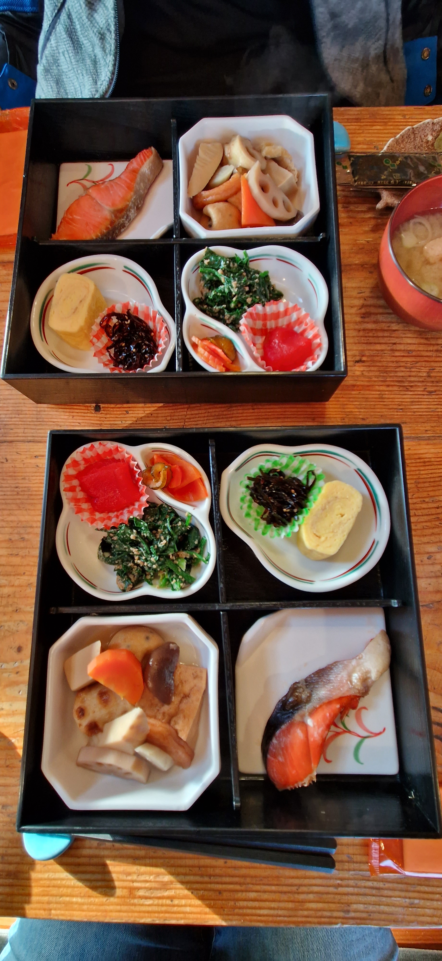 After a chilly night we woke up to a stunning sunrise across Toyako, what a view for our first look at the lake! When we checked in the night before we were able to select between Japanese and Western-style breakfast, and we chose Japanese as with my allergies to wheat, eggs, and milk a Western breakfast is a no-go. We walked up to the main lodge and we were the only other people staying. The breakfast was a great spread, including fresh salmon, oden, tamagoyaki, fish eggs and spinach salad. Of course, it came with rice, miso soup, and beautifully cut oranges to finish.
