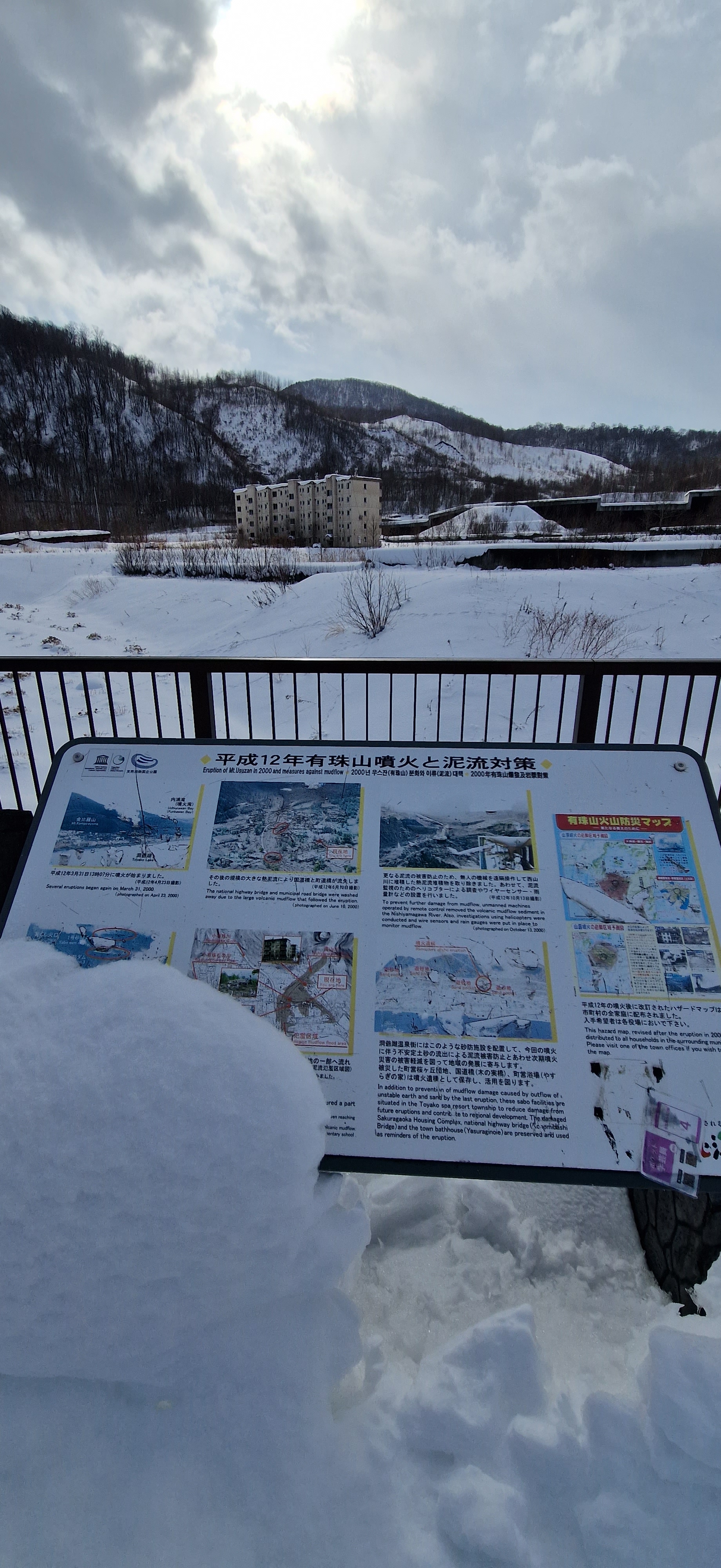 Following breakfast we packed up and headed out to visit the places that were on our list that we didn’t get to the day before. Our first stop was Toyakotenbodai (Lake Toya Panoramic View Point) which is a paid area on the edge of the caldera lake, overlooking an area of the town that was destroyed in the year 2000 following an eruption. It really put our little rental car to the test as the roads were very steep and covered in snow and ice. We made it up without fuss and paid the fee in the little shed at the top. A short walk from the car park leads to the highest point where you get uninterrupted views across Lake Toya, Niseko on a clear day and the craters that were part of the eruption.