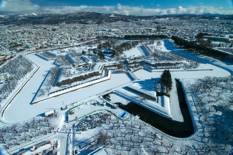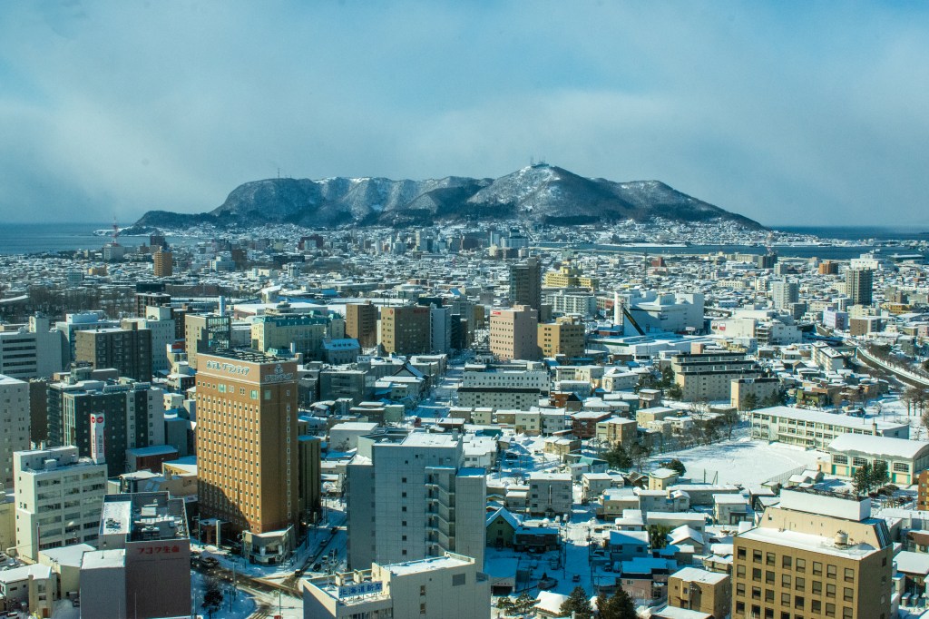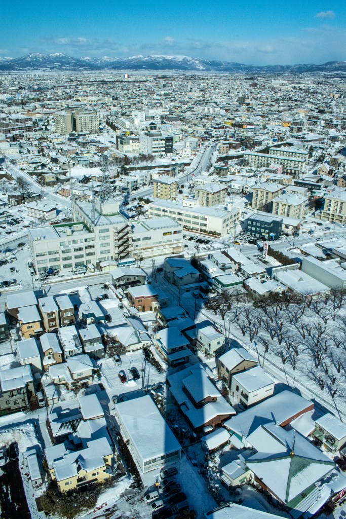 We made it to Goryokaku without slipping in the snow and ice, the best way to see the shape of Goryokaku is by accessing Goryokaku Tower. The tower is 107m tall and overlooks all of Hakodate, the five-pointed fort, and on a clear day, you can see all the way to Aomori. The entrance fee for an adult was 1,000¥ and includes access to both observation towers. We went up in the elevator and were some of the only people there as the tower was only just open, and it was a weekday. The tower gave stunning views of the surrounding area, but it was absolutely boiling inside, so we had to quickly shed our thermal layers before we melted!