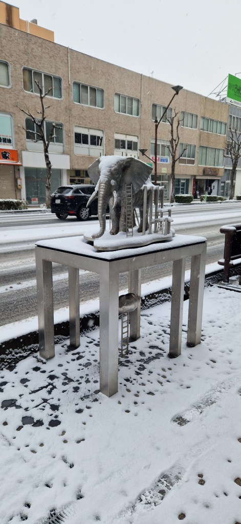 We woke up early to a snow-dusted Nagano City as we wanted to get a good start on our hour drive to one of the places I was most looking forward to on our winter trip. Before heading off we had a walk around Nagano and found a series of very intriguing statues along the main road! I never expected to see a metal hippo or giraffe on this trip.