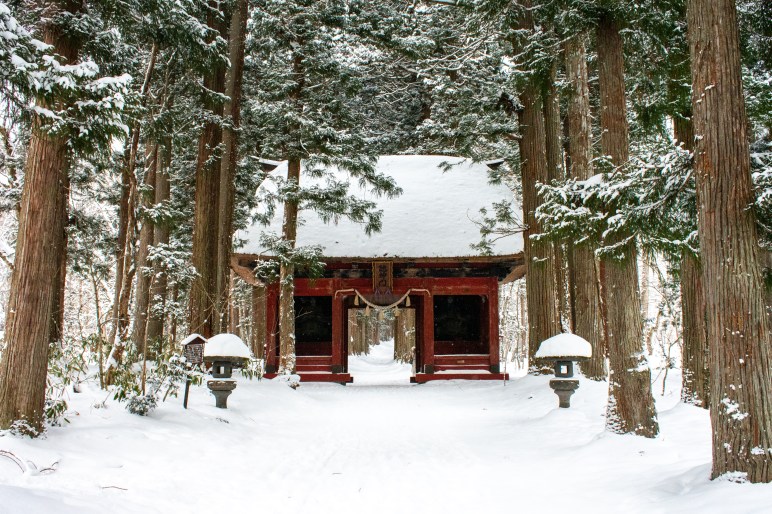 To try and get sunlight back to the world the other deities tried to lure her out by dancing, intriuged by their performance the Goddess peeked out of the cave, and with the door ajar one of the deities tore the door off and threw it away. The door travelled all the way from Kyushu to Togakushi Shrine in Nagano. The upper shrine, which we are headed to, enshrines the deity that threw off the door. Our next stop was Zuishinmon Gate which was stunning in the snow. As we had arrived quite early, we had the gate to ourselves.