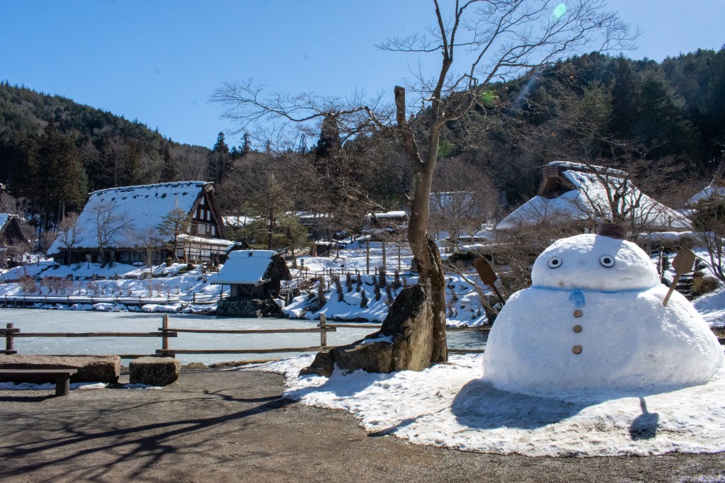 Once we had finished at the view point we returned to the village, but it had become quite busy, and so we decided it was time to go. In total we were at Shirakawago for around three hours, and hadn’t decided on our next stop – the choice was between Ainokura (another gassho-zukuri in Toyama prefecture) or Hida Folk Village back in Takayama. We chose to head back towards our hotel and go to Hida Fold Village, which was an excellent choice. We were greeted by the most enormous snowman I have ever seen, that the week before was a snowy Totoro!