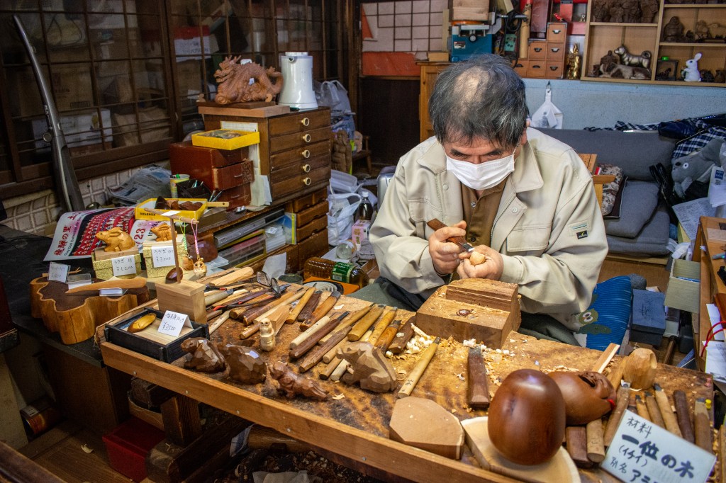 The best part of the whole day came right at the end when we entered a building and found an artisan sat inside, working hard at his craft behind sliding doors. At first we didn’t realise the building was occupied, and enjoyed looking at the carvings on display, and wishing we could purchase them. The artisan opened his sliding doors as we went past, and I enjoyed speaking with him about his craft – Ichii-Ittōbori – carving with yew wood. He said he has been doing his craft for fourty years, and he was certainly a master. We purchased a ten year old daruma carving which had aged beautifully, you can see the back of the daruma in the photo below! I’d love to go back to the village to see more of his work, and perhaps purcahse some more pieces.