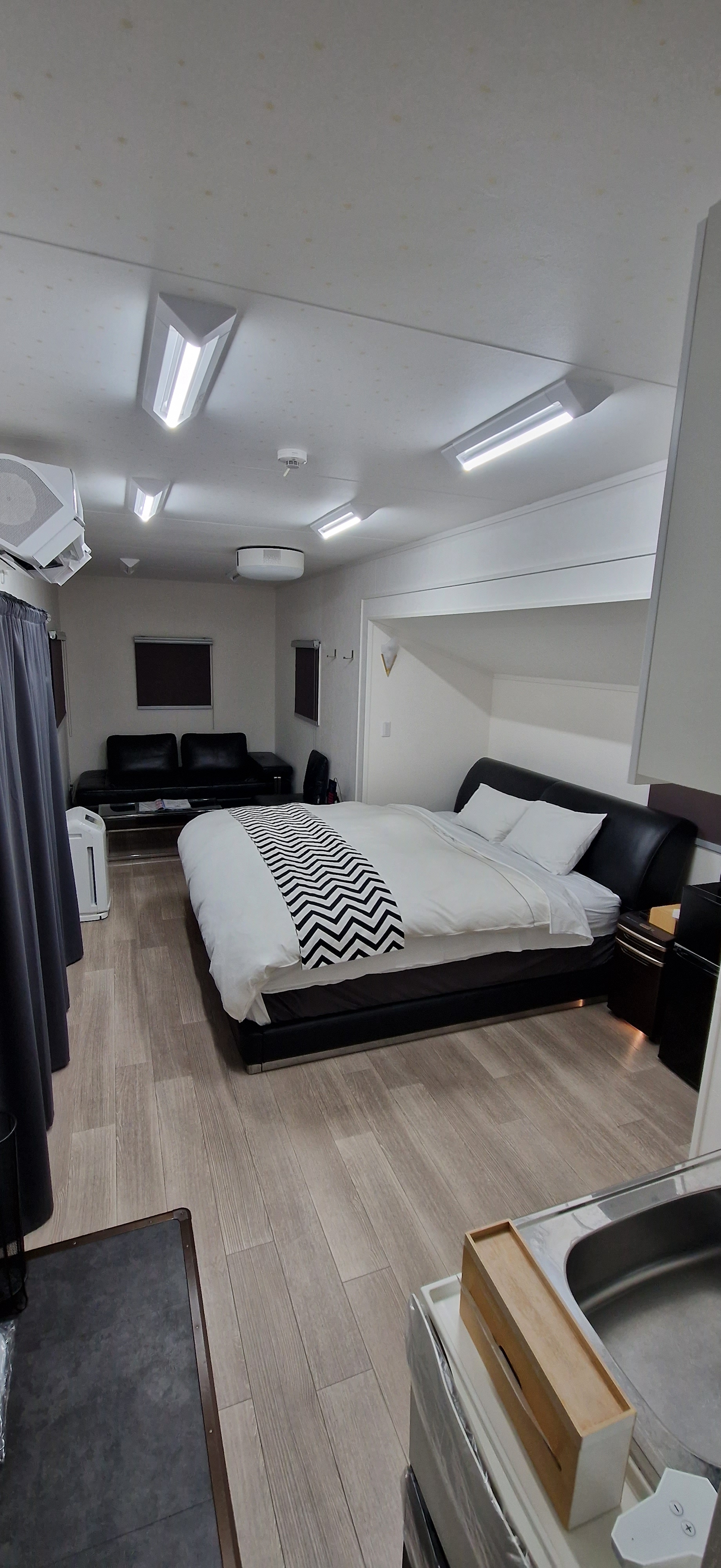 After that disappointment, we left for the final portion of our long journey and arrived in Kawaguchiko. I had booked some interesting accommodation for our week there, which started with a few nights in a shipping container! Lots of new accommodations have been popping up all around Kawaguchiko alongside rises in tourism, and quite a few places chose shipping containers as a solution. I was intriguied, and it really paid off, it was a great place to stay. We had a shower and toilet, a kitchen with two burns, a fridge and microwave, a huge bed, and then a living/dining area with a projector TV. I’d highly recommend a stay at Mount Fuji Panorama Glamping. My only criticism is the website says this unit has a clear view of Mount Fuji, but since it being written new houses had been built which partially obscured the view.