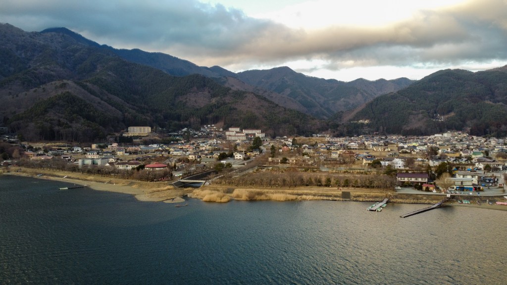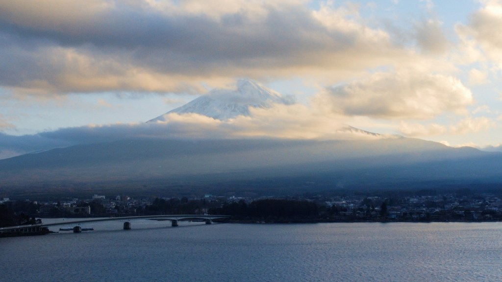 After our double hiking morning, we got back to our home before 3 and settled in for a rest. We decided to go out for sunset in case Fuji made an appearance, and put the drone up over the lake. Fuji was shy and only peeked out from between the clouds now and again.