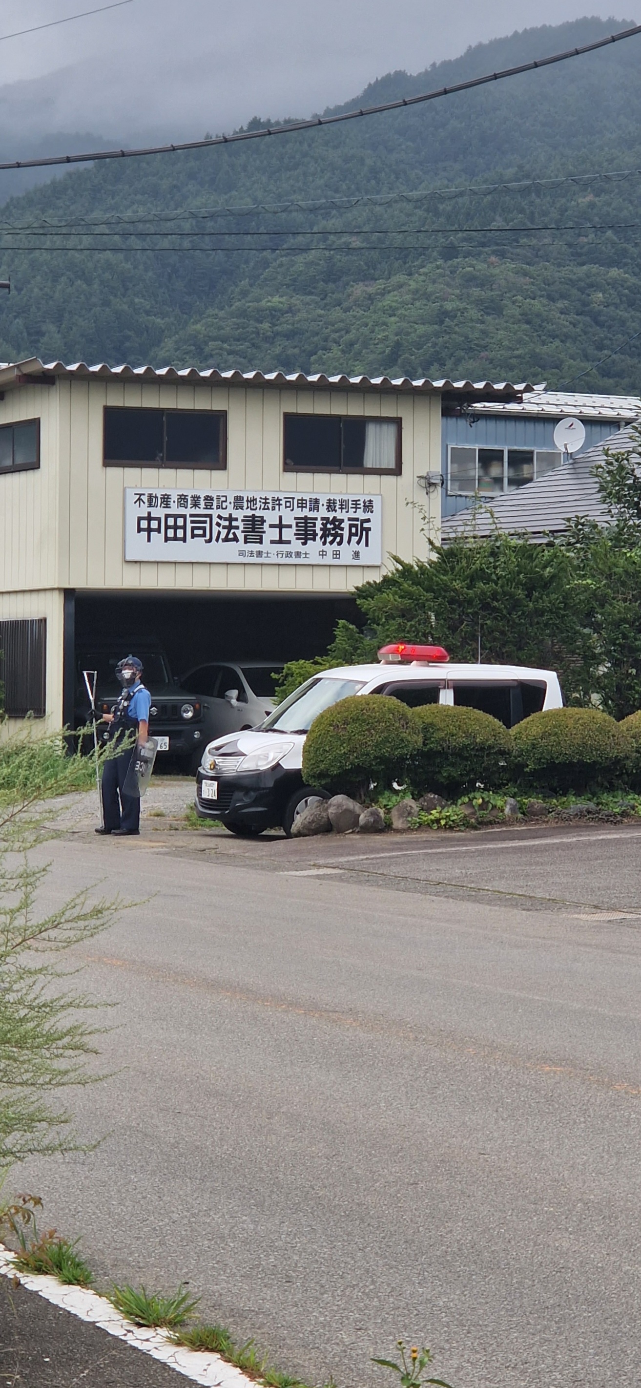 Just as many visitors to Japan may be familiar with the gaijin seat (who seats on a busy train next to a foreigner may stay empty) I also had heard about the gaijin stop – where police will stop tourists. As we were walking along a main road ahead we could see a police car parked at the side, as we got closer the police excited the vehicle and approached us. I thought it was our turn to experience the gaijin stop! The more senior officer asked if I could speak Japanese, and when I said yes he went on the explain that there was a bear nearby that had come down from the mountain, and the area was closed. I explained where we were headed, and that was fine as we would proceed past the affected area. As we walked on we saw the police person in the picture below, decked out in a hockey-style face mask, with a net and body armour – dressed for bear! The second photo is taken from a news article on that day showing the bear in someones garden. Eventually the bear was scared back to the mountains, as it turns out this bear often comes down to steal vegetables and fish.