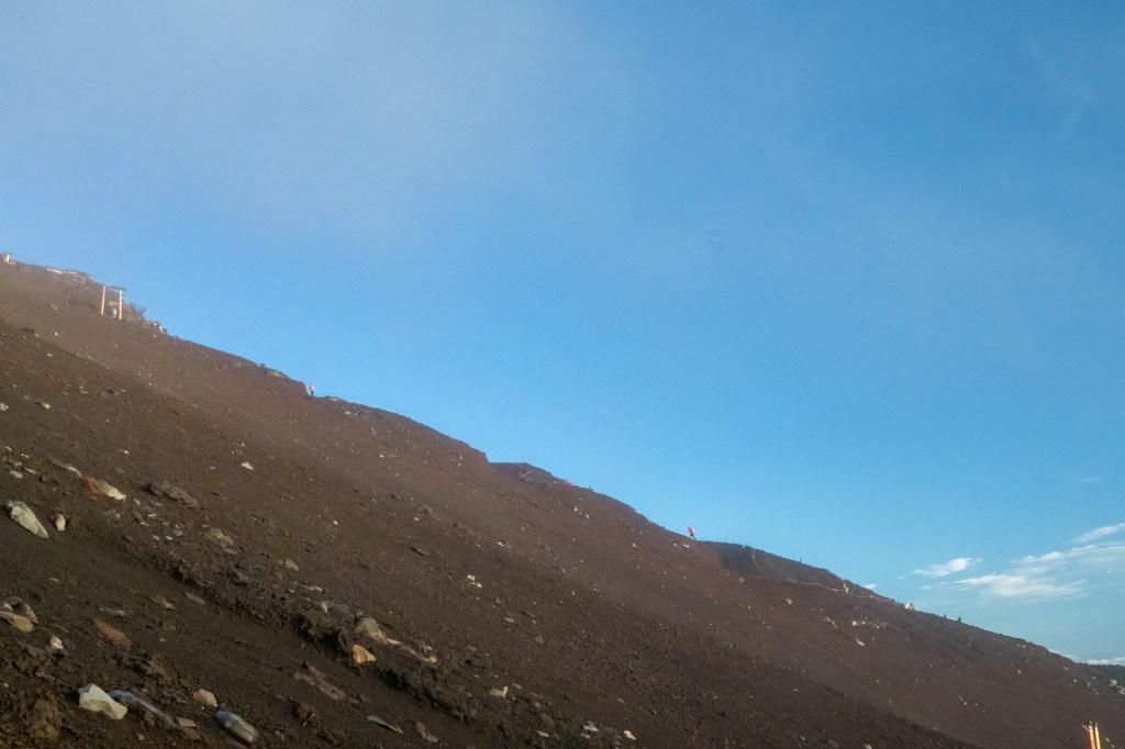 With the weather better than the day before you can start to get an idea of the sheet size of Fuji, and how steep she is too, with almost 45° sides. The first part of our trail down is shared with the Yoshida trail, and so we saw large tour groups waking up and starting their hike to the summit.