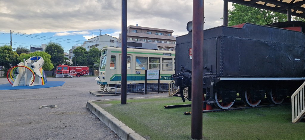 The driers were really quick, and 30-minutes later we were out of the coin laundry and decided to explore a park we could see across the street. The park is called Haginaka Park and was quite unusual and had an area filled with trains, fire trucks, and subway carriages. They were all open and people would be able to go in and explore, sadly, the park didn’t open until 9am and so we weren’t able to get in. Instead, we had a wander around and saw a group of older people engaging in rajio taiso – morning exercises announced on the radio. It is really enjoyable to watch, it would be super fun to join in one day too.