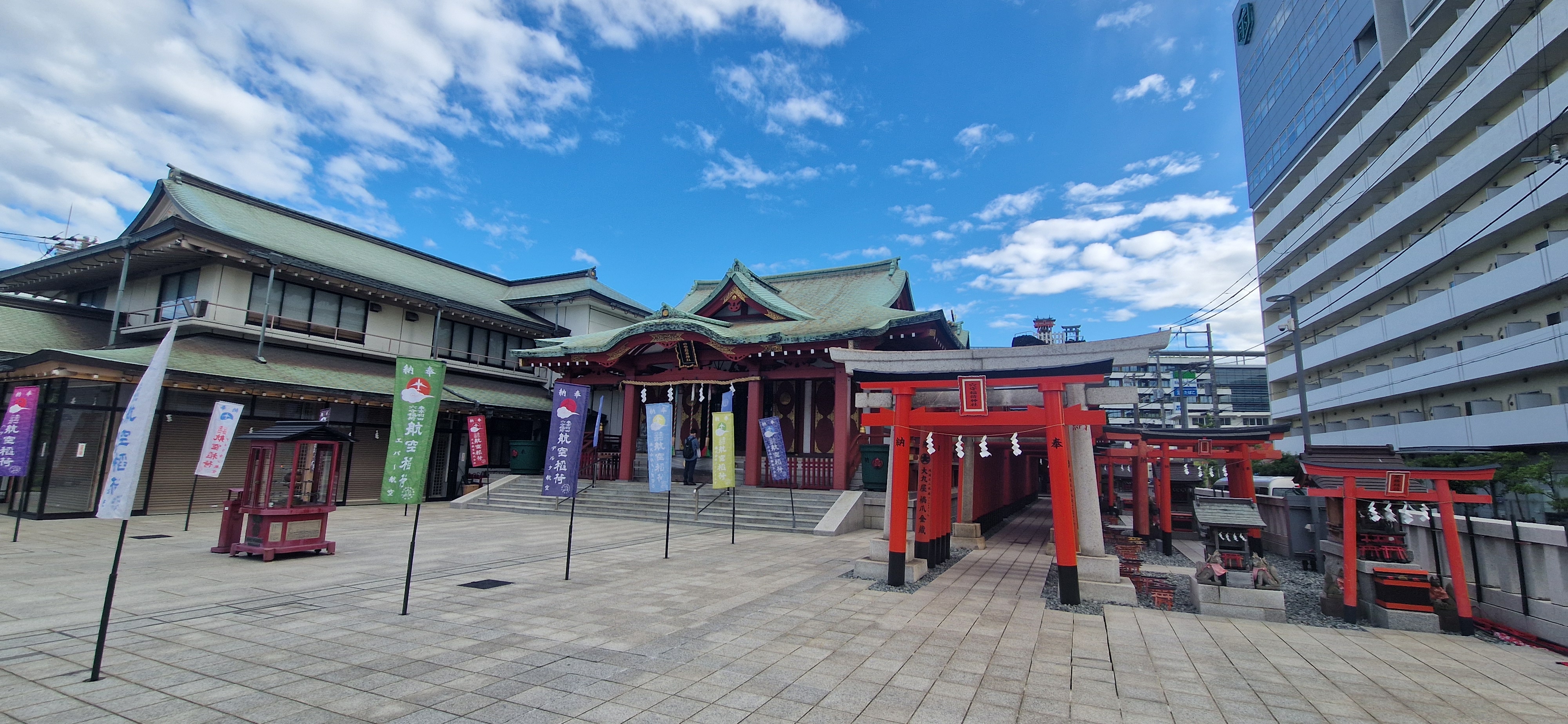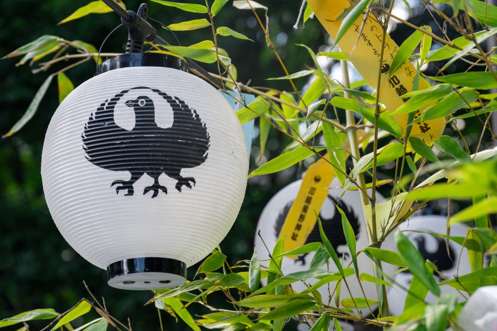 The giant, and smaller, pair of gold and black crows were such a treat! They had the cutest derpy smiles and enormous unblinking eyes! I knew about the typical depiction of the yatagarasu, I really should have expected these cute version after being to Japan so many times. The shrine itself was very small, I guess competing for space hundreds of years ago in a bustling trade town. We spent some time looking at the offering and got ourselves some small versions of the two crows to bring home with us. The shrine was still decorated for tanabata, the star festival which occurs in early July, so we got to see the adorned bamboo along with lamps with the yatagarasu symbol.