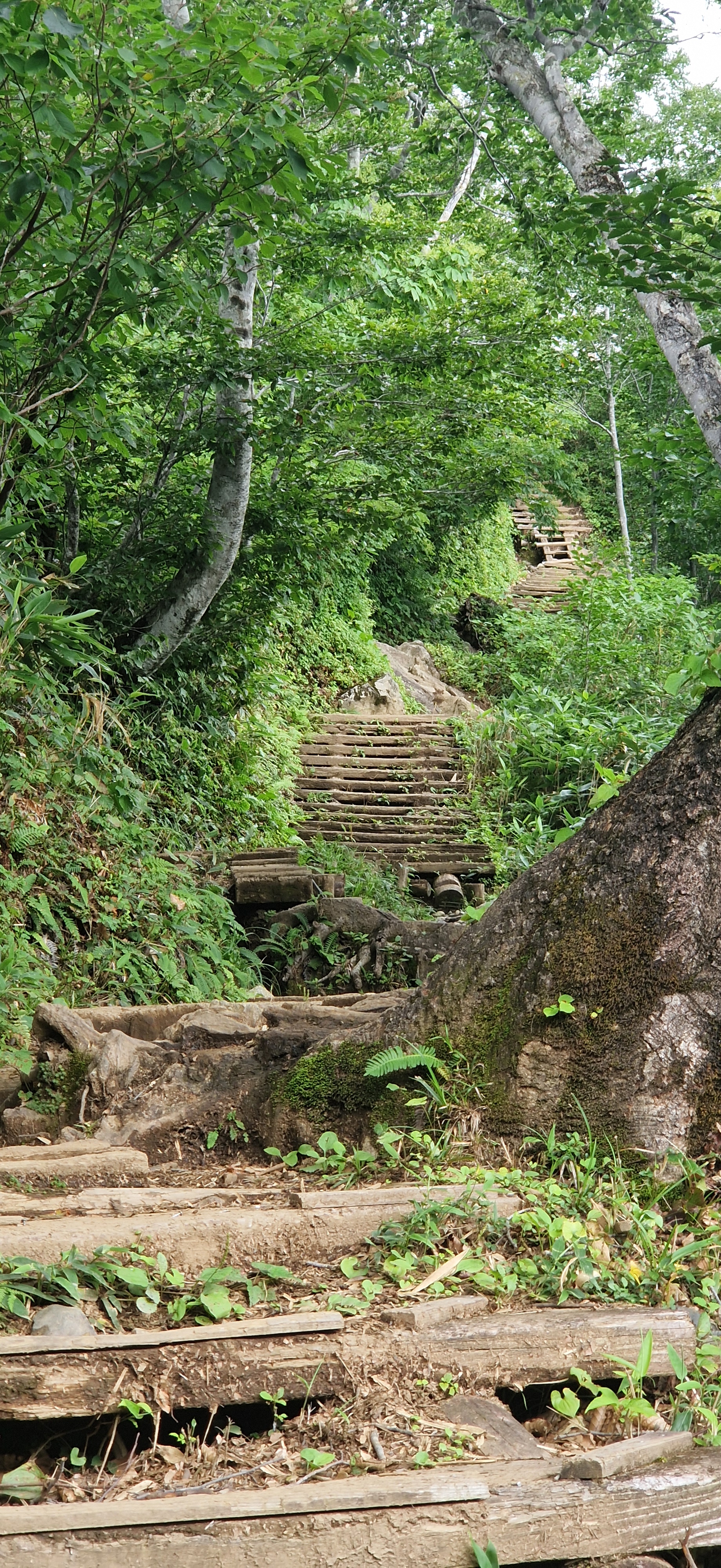 The start of the trail was quite pleasant with boardwalks and stair sections, we were under the shade of the trees, so the temperature remained cool. Quite quickly though the incline kicked up a notch and we were suddenly in direct sunlight and the day was becoming hot. We got to the first rest spot, an emergency hut with nothing inside, but somewhere to get out of the weather. Nature decided a rest wasn’t on the cards for us, or for the groups of other people there, the first part was finding shed snakeskin, and then a suzumebatchi (murder hornet) came out of the bushes and started chasing people. It landed on the back of a hiker and chaos ensued with people running and squealing, and we all had to leave the rest spot and continue up before we were ready.
