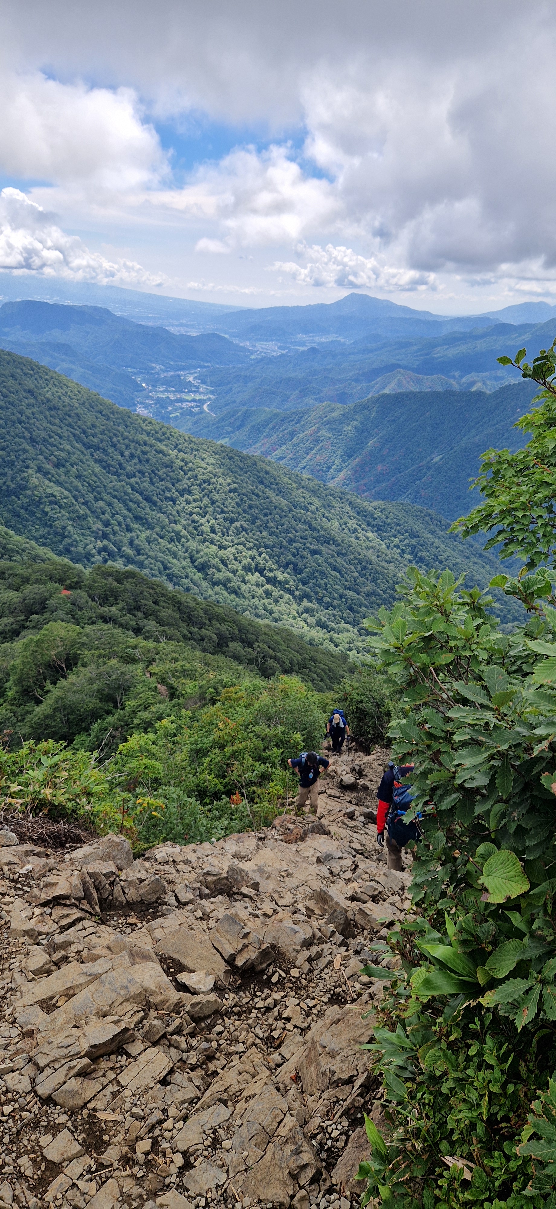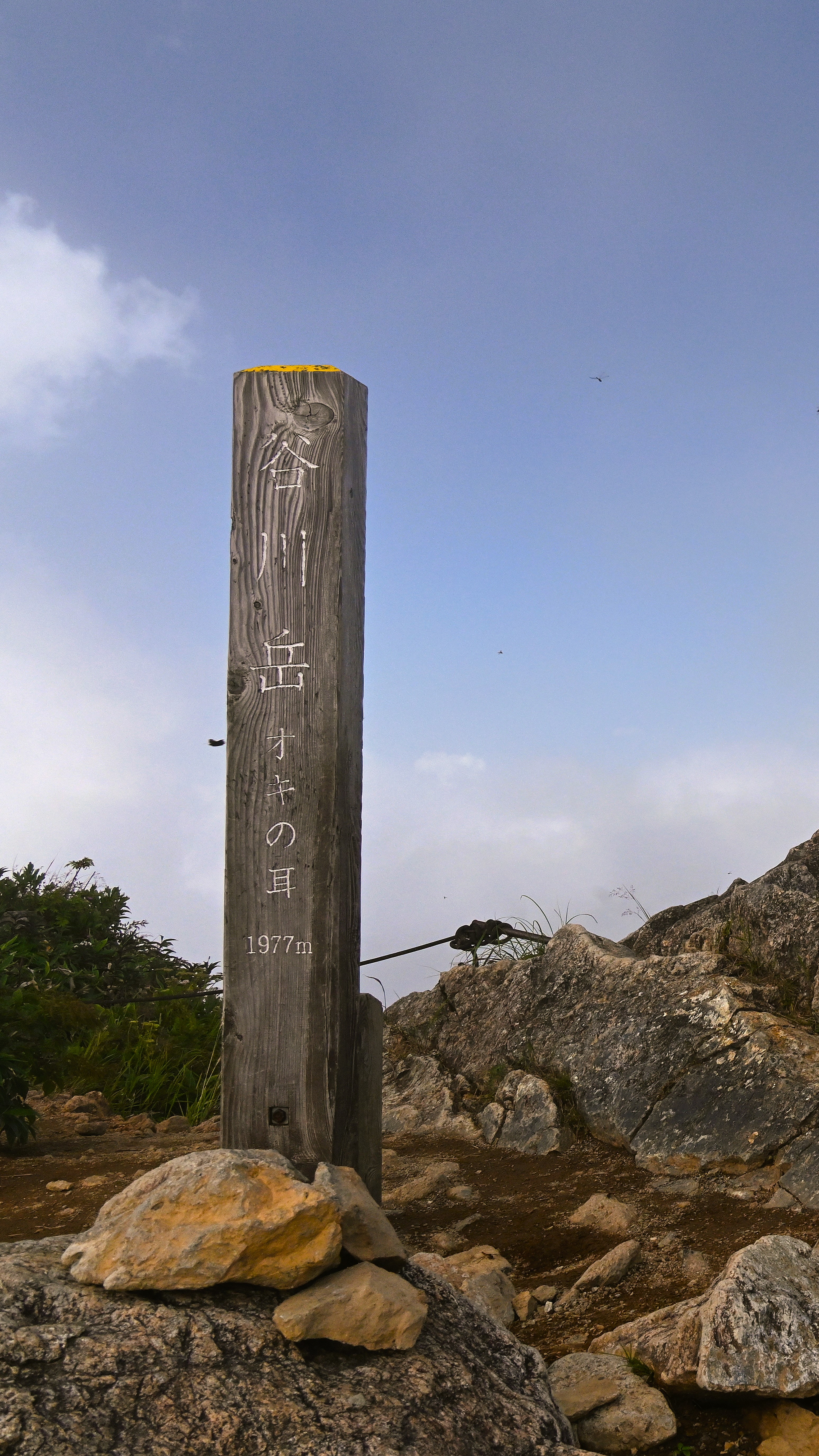 At this point it had gotten quite hot under the direct sun, we got on we got snatches of a view of the summit, but quick-moving clouds made it brief. Our constant companion on the trail were the dragonflies, never in my life have I seen so many – you literally couldn’t look anywhere without seeing one, and it you stood still for more than a second or two then you’d find at least one landing on you. Tanigawadake has one mountain hut near the summit Kata-no-koya, which has only been open as a working hut, rather than an emergency shelter, since around 2003. We popped in to get some drinks and a pin for Tanigawadake for our (small) collection of hyakameizan badges. This is also where the only toilet on the mountain is, and as usual on the mountains they were bio-toilets at there is no plumbing. They were the most stinky toilets we had experienced so far on any mountain, not surprising in the hot and humid weather.