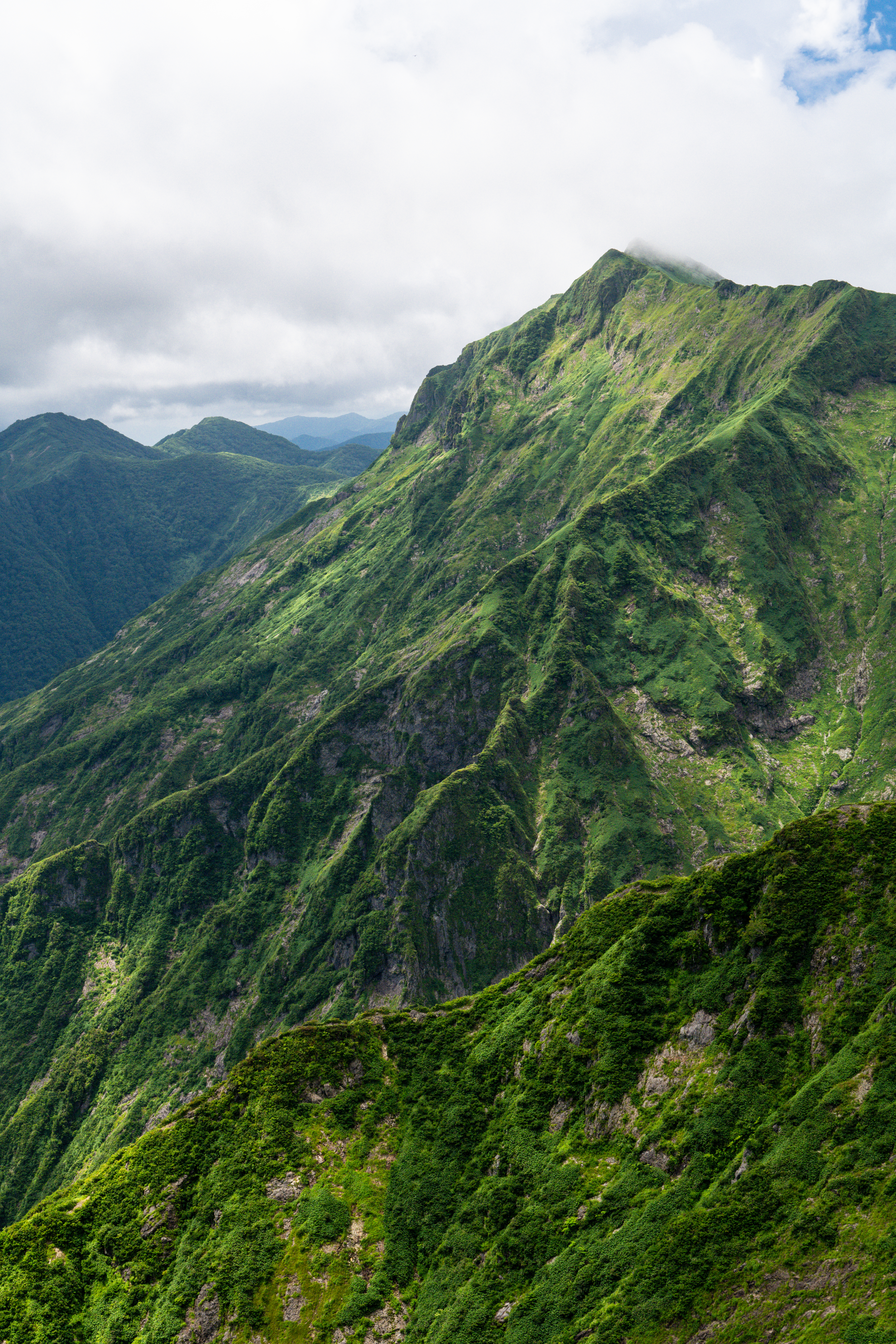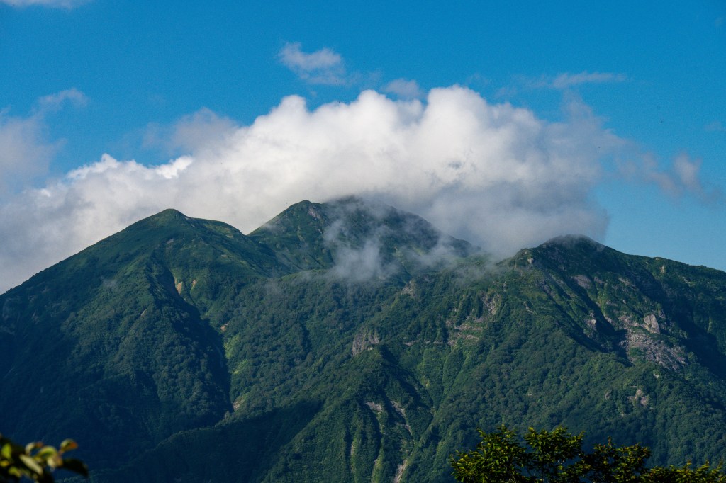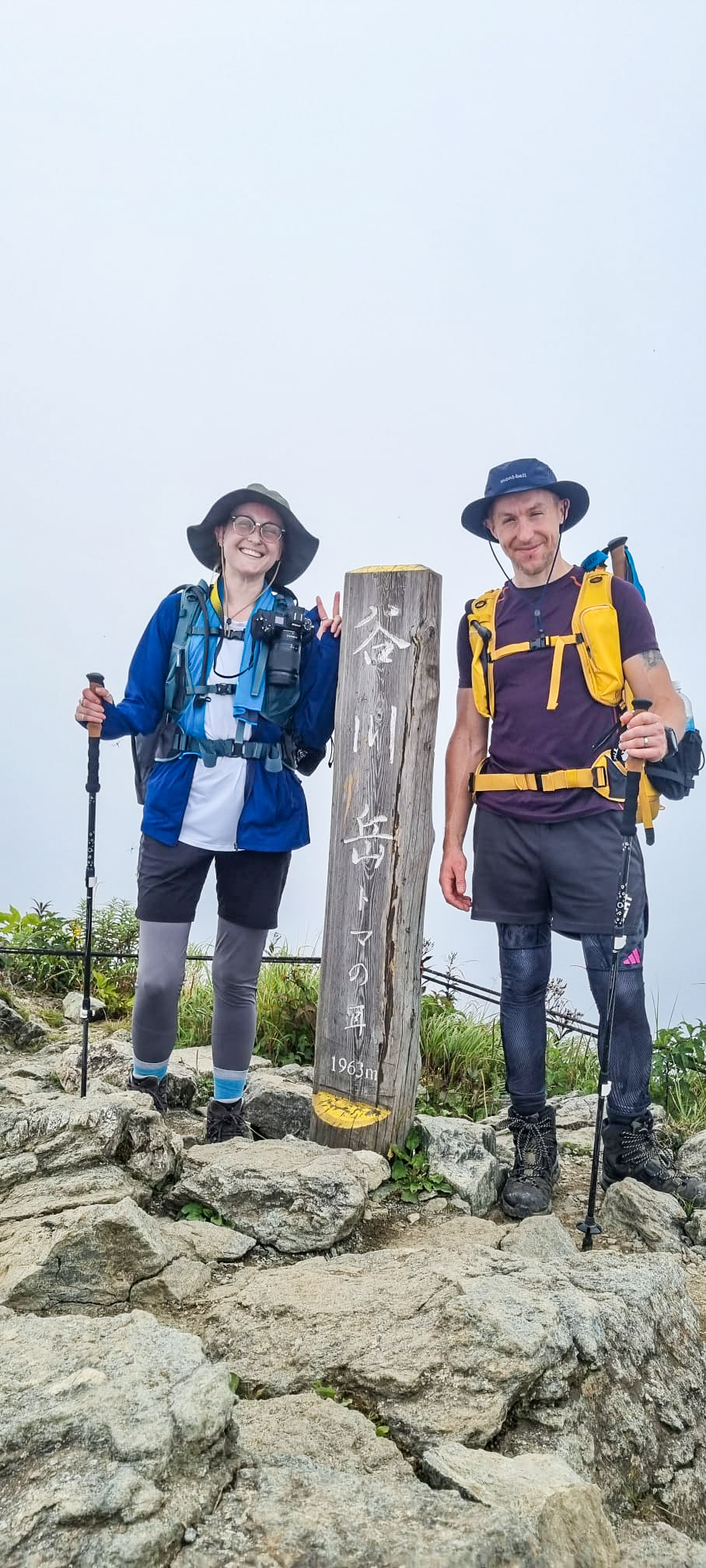 With the heat, sun, and steepness of the trail our “warm-up hike” felt harder than anticipated, harder than climbing Mount Fuji the year before. We pushed on and eventually made it to the first of the two “ears” which are named Okinomimi and Tomanomimi (front ear and rear ear), The first summit we reached was completely in the clouds, the 360-degree view was lost but we were pleased to have made it. We didn’t feel like we had achieved this hyakumeizan without visiting both official summits, and so we headed off the second, which got us some snatches of views between the clouds.