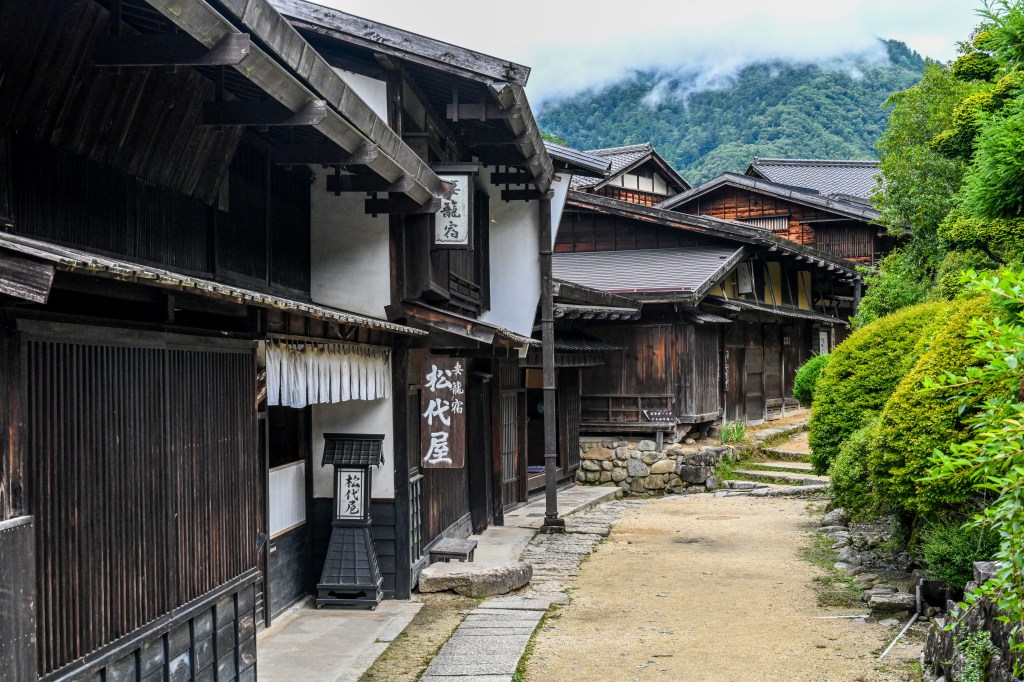 There is plenty of free parking at the southern end of Magome-juku, which was almost entirely empty when we arrived (perhaps due to the inclement weather!). We initially suited up in our waterproof over trousers and coats, but it was so incredibly humid and so we quickly realised they weren’t needed. Sadly, the clouds and humidity meant we had no view of the surrounding mountains, but the empty town was so beautiful it almost didn’t matter.